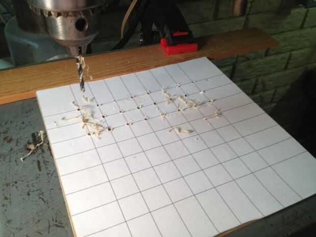 Después de crear mi primera plantilla de montaje con el espacio que se recomienda, inmediatamente encontré que algunos de los cátodos agachado alcanzaría apenas para la próxima etapa. Hice un segundo artefacto con espaciamiento más cercano un par de mm para permitir la soldadura más fácil. Creo que la medición final fue de 14 mm entre centros. Después de usar cinta adhesiva para mantener el LED es soldado en varias capas, surgió una pequeña herramienta que pudiera sostener el siguiente LED en alineación exacta. Consistió en un pequeño taco de madera con un corte de Sierra de tamaño para el cátodo. Un pedazo de paja de plástico con una muesca en se deslice sobre el corte para mantener el LED en su lugar.