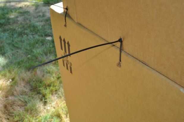 Para fijar la caja superior, zip-até lo. Rápidamente me di cuenta de que un golpe de mano fue ineficaz hacer agujeros en esta cartulina gruesa, así que usé mi taladro inalámbrico y 5/16 Avos"broca para taladro de agujeros donde irían los lazos zip a través de. Un agujero a través de la caja superior y dos a través de la caja de fondo me dieron un montón de área superficial y "agarrar" para que los vínculos ir a través.