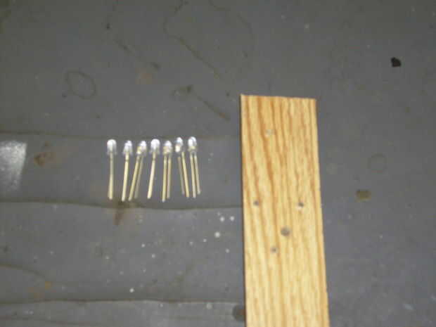 Los materiales son muy simples ellos son: -7 LEDs 5mm (utilizaré azul 3,4 voltios los) -bloque de madera o desecho de madera -plantilla para taladrar (será proveen esto)