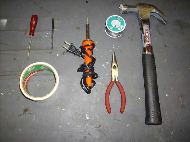 Las herramientas son muy básicas ellos son: -soldador -soldadura -alicates de nariz de aguja -taladro o taladro de columna (utilizando una prensa del taladro se sugiere) -13/64 broca -cinta adhesiva o pegamento -lezna del rasguño -martillo