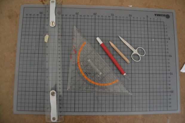 -regla, un triángulo, un lápiz, tijeras pequeñas, un cuchillo del exacto y una almohadilla de corte