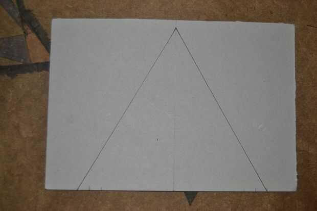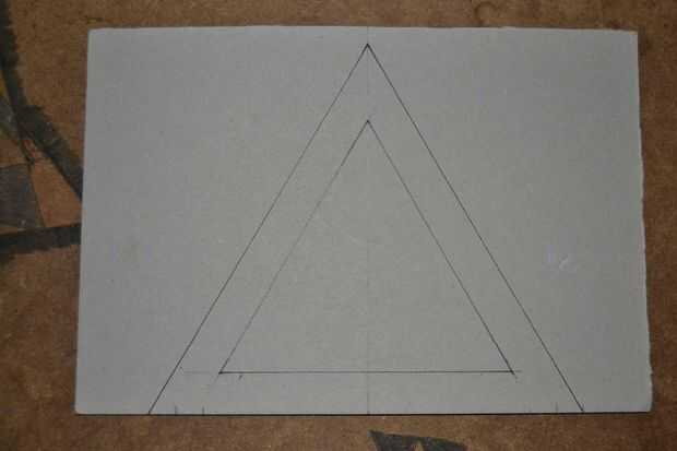 dibujar un triángulo equilátero (todos los ángulos son de 60 grados) de su tamaño deseado sobre un trozo de cartón, a continuación, dibuja otro triángulo dentro del triángulo grande con todos los lados siendo 1,5 cm los lados grandes trianles.