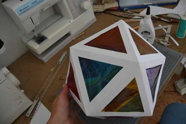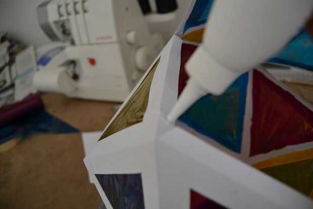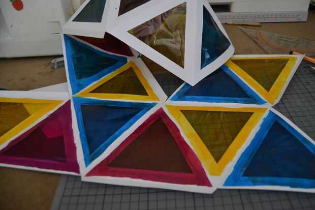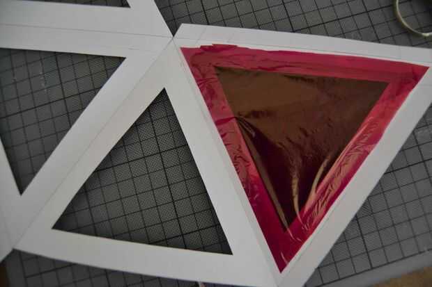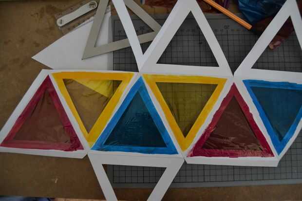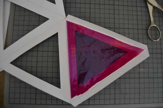 pegar los triángulos de papel plástico en el papel desde el lado izquierdo. ver a él que no triángulos adyacentes tengan el mismo color, ya se verá mejor en el acabado sólido. una vez pega una hoja detrás de cada ventana de triángulo, pegue la partes juntos (echa un vistazo a su plan del paso 3 para obtener ayuda) primero pegar el conjunto sólido juntos, se solapa a la vez. la última maquina será un poco difícil porque no puede pulsar en la solapa desde el interior, pero cuidado trabajo te llevará allí.