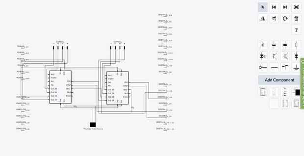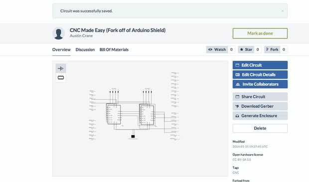 Hice este circuito en el 123D y estoy entusiasmado con todas las funciones cool para ayudar con la estructura, costo, esquemática y en interacción con su circuito. Te recomiendo revisar este circuito circuito 123D en http://123d.circuits.io/circuits/92930-cnc-made-easy-fork-off-of-arduino-shield