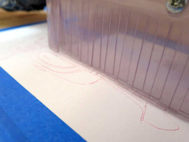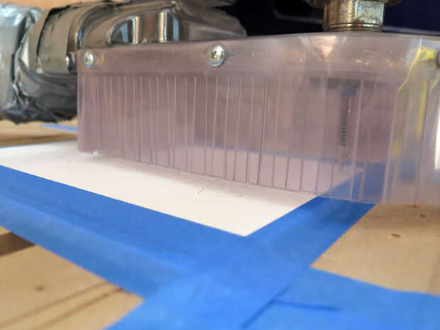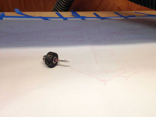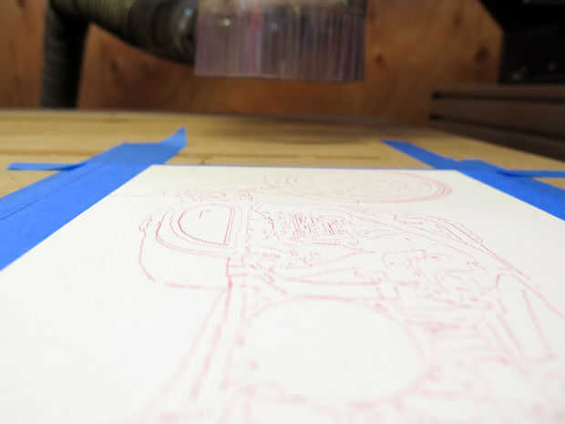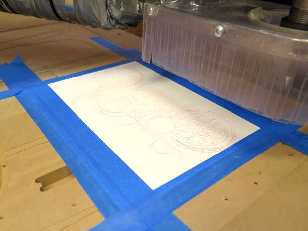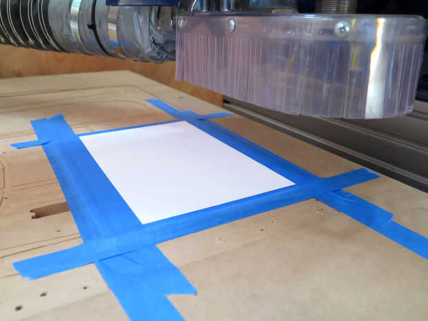 Coloque su lona de 8 "x 10" en la mesa de trabajo de la Shopbot. Utilice cinta para fijarlo. Trate lo mejor que le cuadrado para la tabla también.