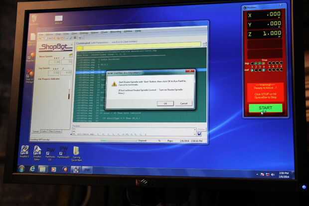 Abra su archivo de trayectoria de herramienta y pulsa Start. Usted será incitado un mensaje de advertencia para comenzar su Router/eje. No vamos a hacer el eje funciona así presione OK. El Shopbot ahora comenzará a moverse y hacer su dibujo.
