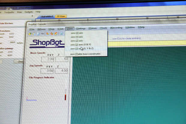Encienda el Shopbot y el ordenador. Abra el administrador de Shopbot. Poner la pluma en el cuello y estás listo a cero la máquina en 3 ejes. Mover X, Y y eje Z para que estés muy cerca de la esquina de la lona. Una vez que el lápiz toca el borde de la tela uso Z3 a cero X, Y y Z eje manualmente. Impresionante, ahora estás listo para comenzar los dibujos!