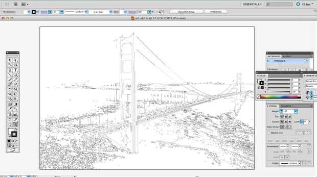 Me decidí a hacer un dibujo enorme para nuestra oficina en el muelle 9. Usé el Adobe Illustrator para vectorizar una imagen del puente Golden Gate con calco. Aquí mi plan era usar un lienzo tradicional de Darice estudio 71 24 pulgadas por 36 pulgadas y colgar en la pared. El proceso fue casi lo mismo pero los resultados fueron considerablemente diferentes.