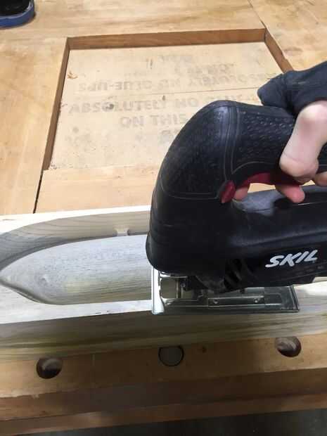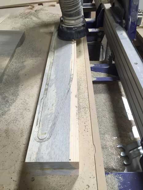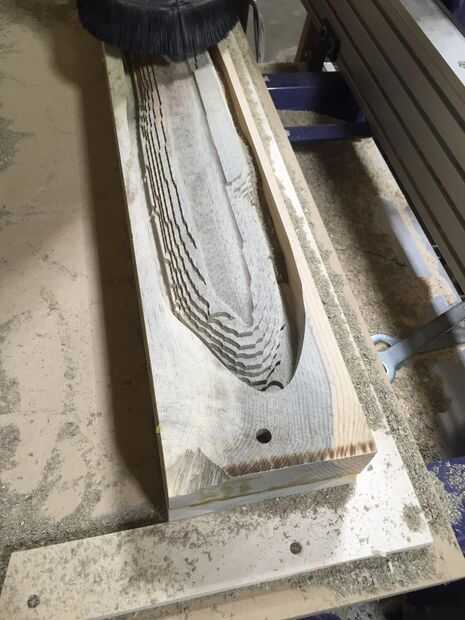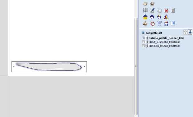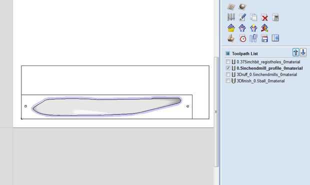 Después de la talla de las pasadas de desbaste y acabadas, ejecutar un perfil pasen a una profundidad de 2" con una fresa larga de 0.5" espiral hacia abajo. Puesto que el material es tan espeso, esto es importante hacerlo para todos a través de tallar y facilitar sin tabulación el modelo.