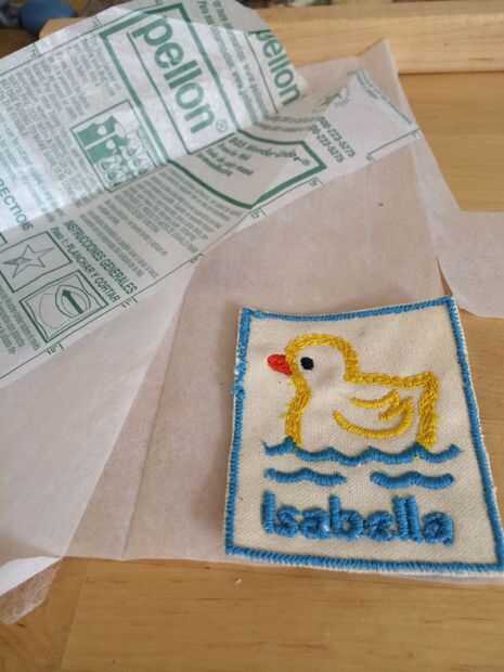1. el primer planchado será sólo la parte posterior del parche al papel en el lado áspero de la pellon. Esto aplicará un adhesivo a la parte posterior del parche.