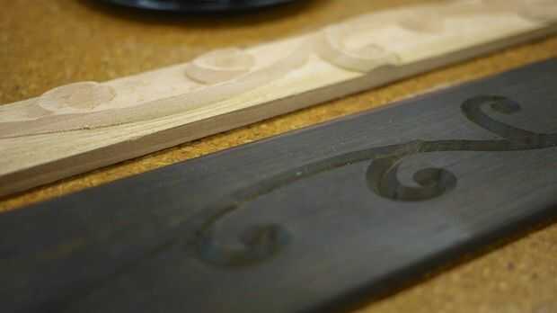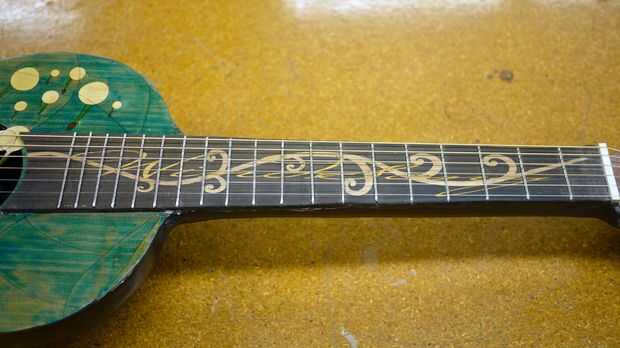 En la última foto, también se puede ver otro embutido sobre el primero - el nombre de la guitarra "WindSong" - que es incrustaciones usando otro método descrito aquí.