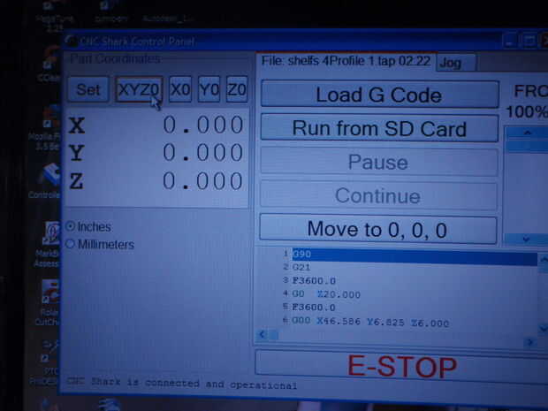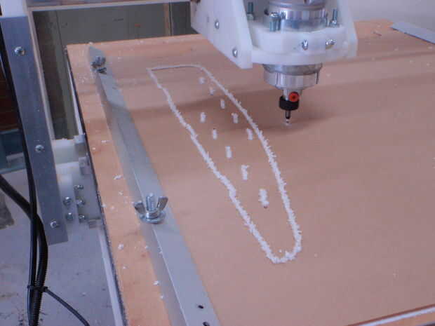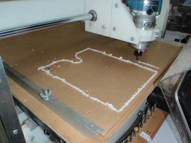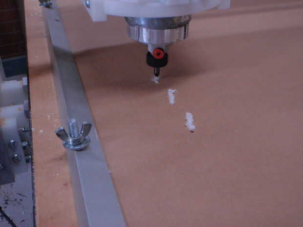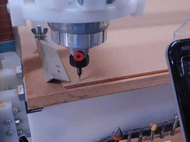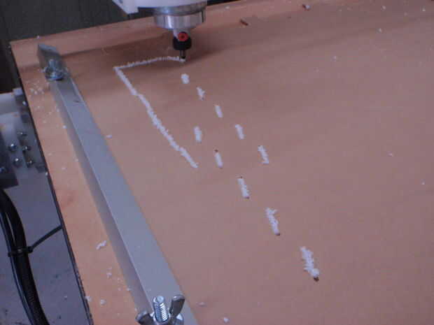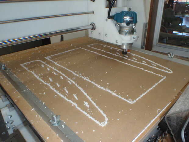 Cero la máquina en la esquina inferior izquierda del material y asegúrese de que tiene 2,8 mm molino final instalado en la máquina. Encontré que una fresa de corte recto corta plástico sin levantar el plástico de la cubierta, a diferencia de un tipo de espiral que puede causar problemas.
