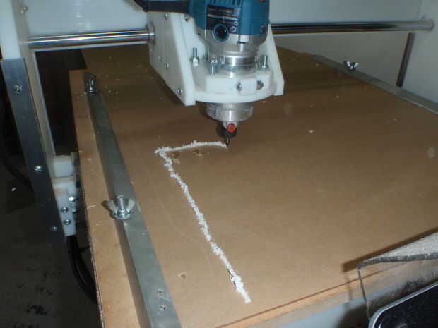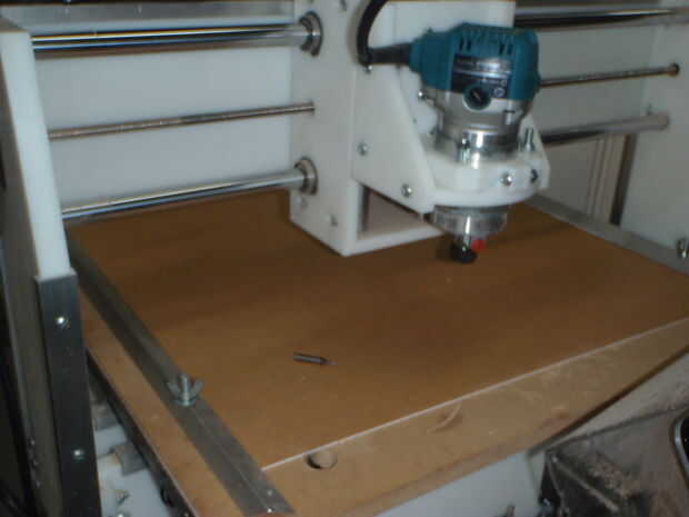 Monte la pieza de 600 mm X 1200 mm de acrílico en la parte superior un trozo de material para parar la herramienta de corte de atacar a la cama de la máquina. Hecho algunos soportes para mantenga pulsada la hoja grande.