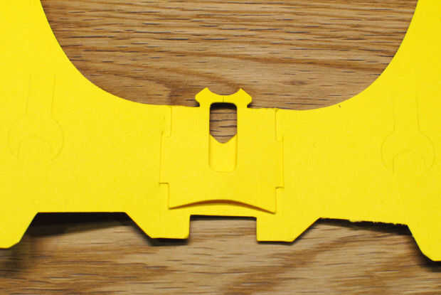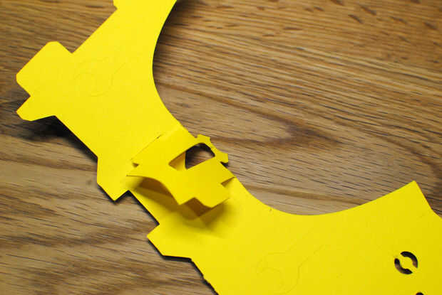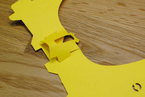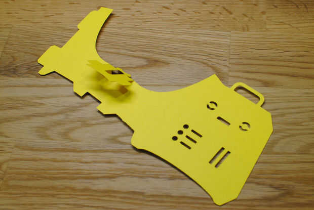 Doblar la parte delantera de la ranura de Fizzbit y meter las dos lengüetas en la parte en las ranuras sobre las patas traseras de la Fizzbot. Empuje todo plano una vez que las fichas han sido asomó a través.