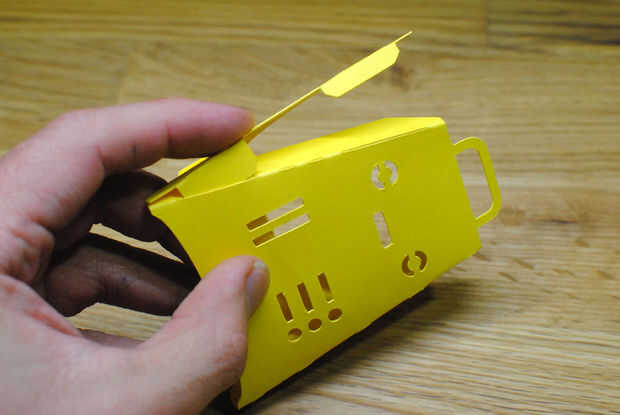 Doble a lo largo de la línea punteada y su Fizzbot debe comenzar a tomar forma. Meter las dos lengüetas sobresale el lado izquierdo en las ranuras en el doblez en el borde derecho.