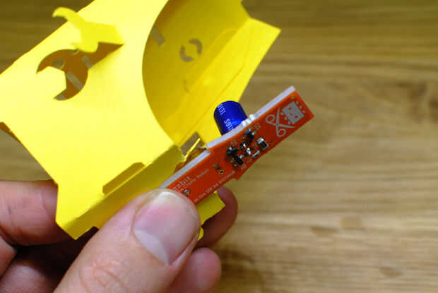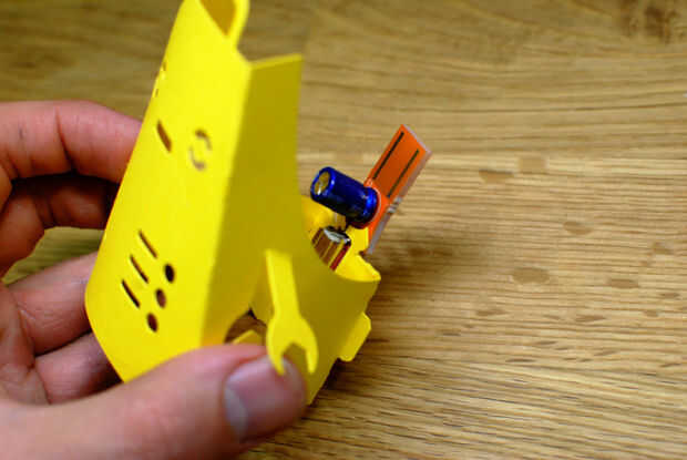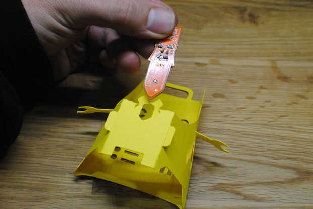 Tomar la Fizzbit y cuidadosamente empuje el motor entre los dos ganchos sobre la ranura del Fizzbit. Tire de la Fizzbit ligeramente hasta que el extremo puntiagudo puede deslizarse más allá de la muesca triangular en la parte posterior de la Fizzbot. Entonces debe ser capaz de bajar el Fizzbit en su lugar. Si ya no está en el lugar correcto empuje hacia atrás los ganchos en la parte superior del motor. Se debe ahora a cabo con seguridad. Si usted encuentra que los ganchos no están sosteniendo la Fizzbit en su lugar cuando usted tira de la Fizzbot de la USB, utilice un poco de pegamento o cinta de doble cara en la parte posterior de la Fizzbit, detrás del motor.