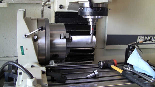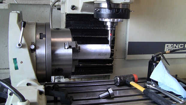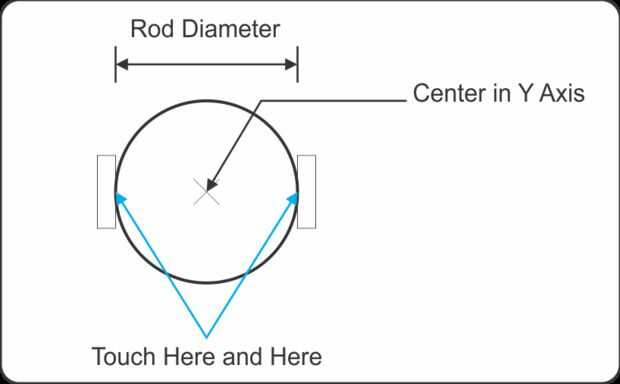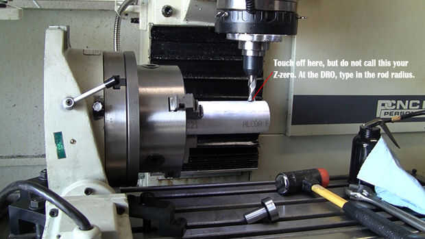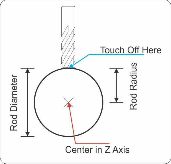 Encontrar el centro en el eje Z, sin embargo, no se puede hacer por este método porque no tenemos acceso a ambos lados. Podemos tocar en la parte superior, pero no en la parte inferior. Por lo tanto, lo que hice (y me costó tres intentos para conseguirlo derecho por errores tontos) es tocar en la parte superior (con la corte real), pero en lugar de puesta a cero hacia fuera el eje Z, he escrito el diámetro de la barra dividido por dos (por ejemplo, el radio de la varilla).