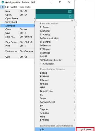 Haga clic en el menú de abajo-abajo de archivo, desplácese hasta ejemplos -> Grbl y seleccione GrblUpload.