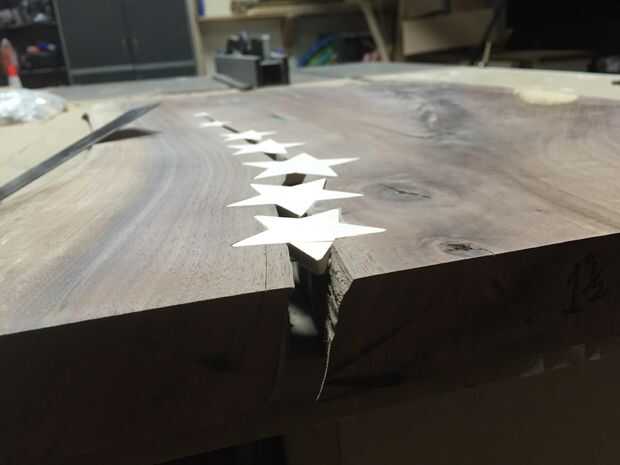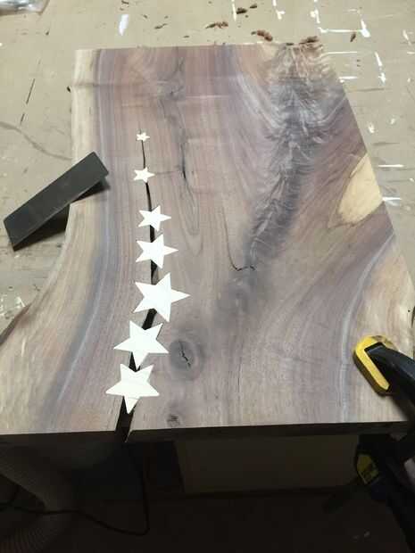 Empecé con papel de lija de grano 120 para nivelar las estrellas, raspa la tapa entera, utiliza un trapo húmedo para elevar el grano de la madera y lija en la parte superior rugosa con papel de lija de grano 220. Mano de lija en los bordes de la losa para ablandar las esquinas afiladas.
