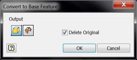 5. Inventor le presentará una ventana titulada: "Convierte a función de Base", asegúrese de haber seleccionado la opción para sólido / superficie (icono de la izquierda) en lugar de compuesto.