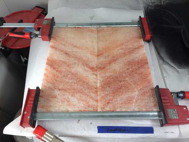Borde pegando las dos mitades fue similar al proceso de laminación de acrílico se describió anteriormente. Su material de la abrazadera hacia arriba y esperar a que el epoxi cure completamente antes de proceder al mecanizado.