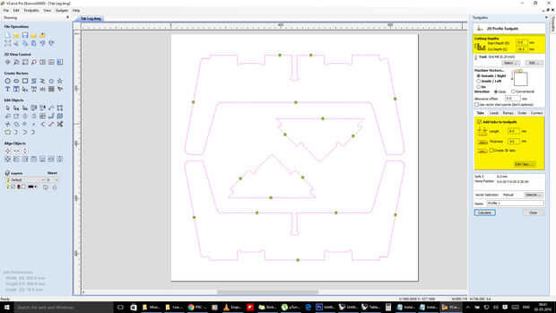 Nota sobre la creación de pestañas: Son piezas de su material que no corte para sostener las piezas en su lugar. Para este corte de perfil no uso pestañas ya no eran necesarios y la cantidad a cortar era muy pequeña.