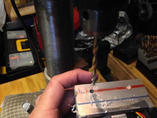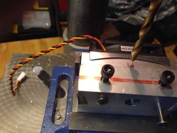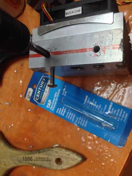 Cerca de los bordes de la ranura, perforaciones #25 mediante el ángulo de aluminio y en el lado del refrigerador de la CPU, aproximadamente 1/2" de profundidad. Continuación del hilo de rosca estos agujeros usando una llave de 10-24. Tenga cuidado de espaciar los agujeros para que no corra en los tornillos que sostienen el ángulo de aluminio para el Cooler de la CPU.