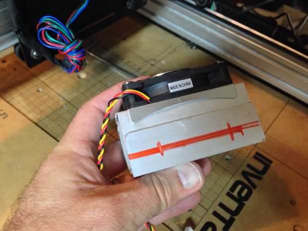 Mantenga el refrigerador de la CPU y de aluminio el ángulo contra el carro de pórtico eje x de los 2 Shapeoko y use un marcador para marcar donde se alinee la ranura en el ángulo de aluminio.