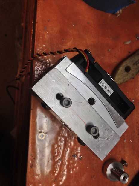 Perfore un orificio en la parte superior del enfriador de CPU alineado con el orificio de 1/2" en la base y penetrar en este agujero. Se ejecutará los cables desde el módulo de láser a través de un lado con este nuevo agujero. 5/16" bits deberían ser suficiente. Los cables deben protegerse con tubería del encogimiento del calor.