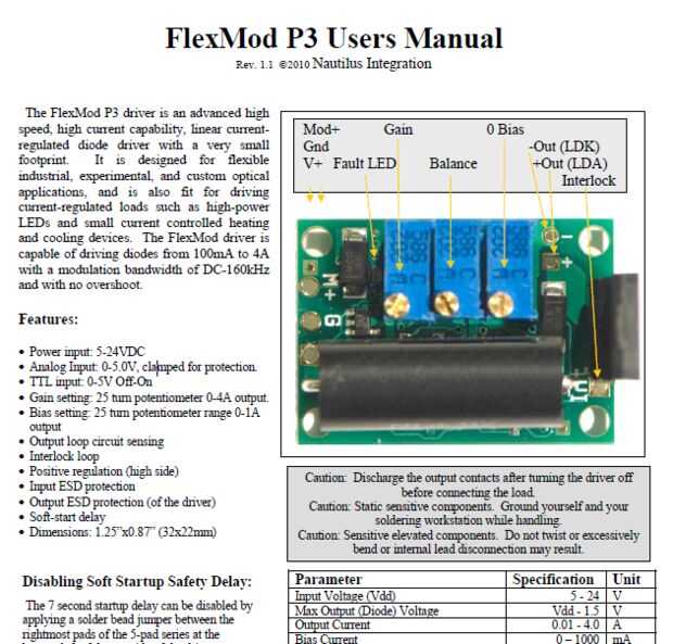El FlexMod P3 necesita ser calibrado para que un PWM 0 (o valor de la tierra) en la modulación de entrada apenas enciende el diodo láser en lo que es visible. Un valor de 255 total o 5 voltios en la modulación de entrada deben producir no más de 1,8 amperios! Comprobarlo con un polímetro usando las instrucciones suministradas con el controlador FlexMod P3!