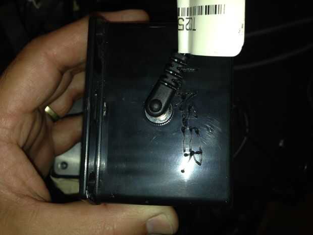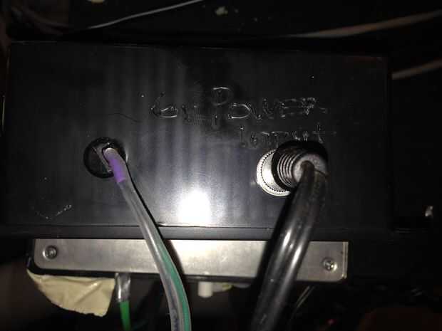 Otro conjunto de cables debe dejar el cuadro. Usted puede usar otro enchufe o algún otro tipo de conector. Elegí a abrigo del encogimiento del calor los cables y los saca de un agujero en el lado de la caja. El otro extremo de estos cables puede conectarse a 2 conector de enclavamiento de posición o puede soldarse directamente a la Arduino/GShield. El cable de tierra se conecta a cualquiera de los puntos de soldadura de terreno en la GShield. El cable de señal que se suelda al conector de M(od) de la FlexMod P3 será soldado a un punto de conexión en el GShield que va al Pin 11 en el Arduino. (Ver fotos para detalles.)