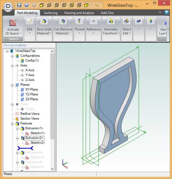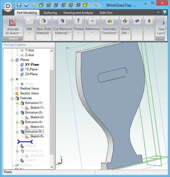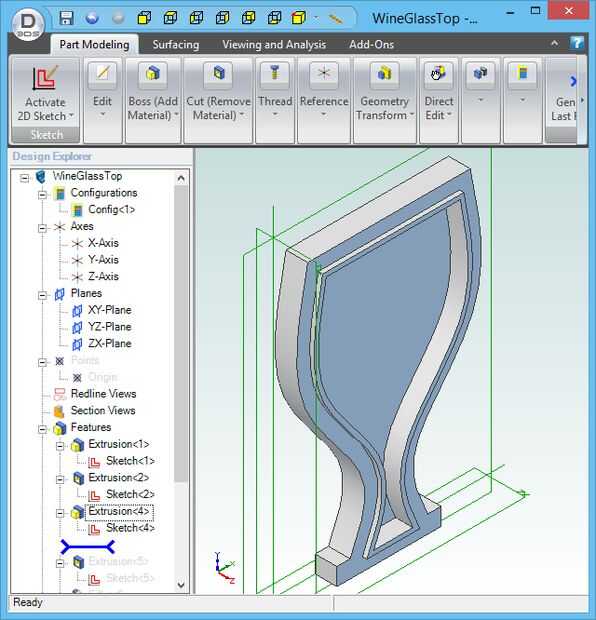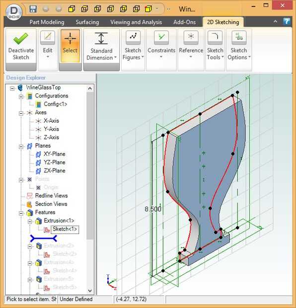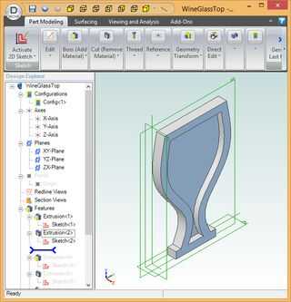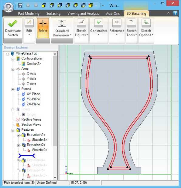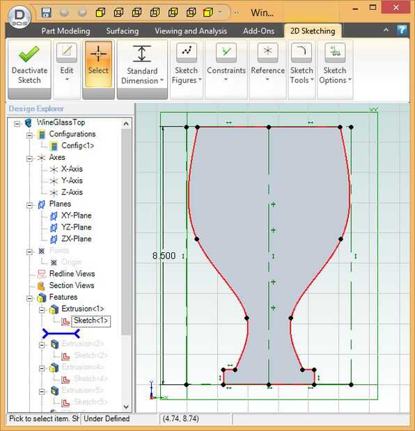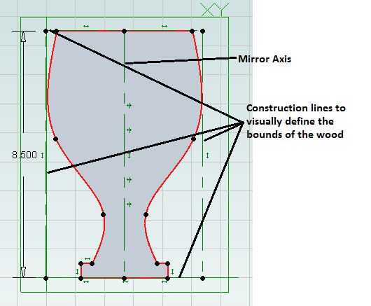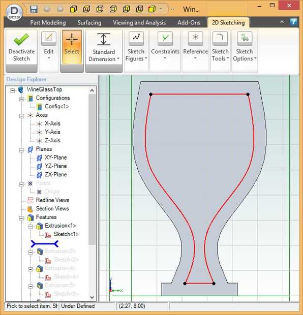 Para crear un modelo, dibuja el contorno del objeto (llamado "dibujo" en la mayoría de los programas CAD 3D), primero sacan a la requieren espesor. En mi caso, el esquema es el de una copa de vino bosquejada utilizando splines para dar la forma lisa. Para asegurar la simetría del diseño, es mejor esbozar la mitad izquierda y luego utilizar la función de "espejo" para el dibujo al lado derecho del espejo.