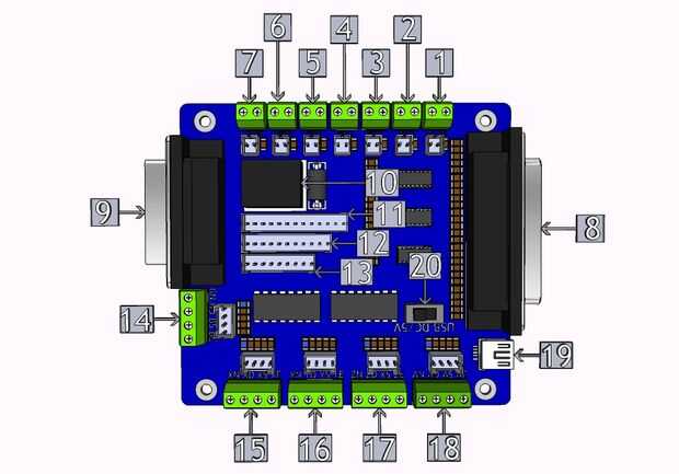 Arriba puedes ver una foto de la placa breakout. Se trata de cómo yo he cableado lo (que pueden diferir un poco del HobbyCNCAustralia sitio enlazado arriba). Mi cableado es específico de corte por plasma.