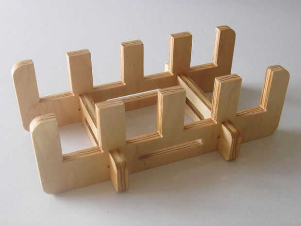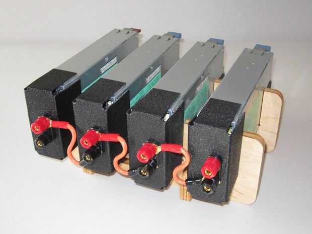 Esta bandeja de madera simple, hecha en una máquina CNC, hace el truco. Conserva la pila en un paquete compacto y portátil, permitiendo el enfriamiento por aire para llegar a las fuentes de alimentación.