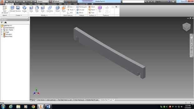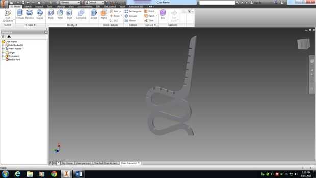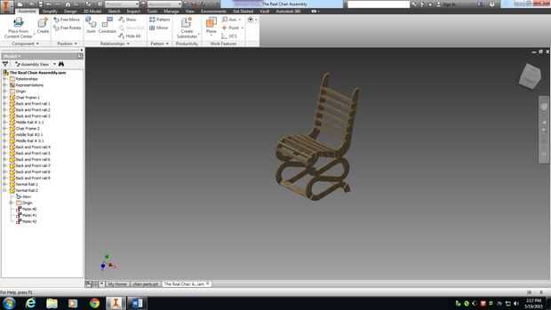 Después de un par de semanas de lluvia de ideas mi pareja y yo por fin decidido que diseño a utilizar. Lo tenía que hacer después de esto es transferir nuestras ideas de papel a la computadora. Entonces juntamos todos nuestras piezas en un archivo de ensamblado por lo que pudimos ver cómo sería nuestra silla. Nuestro diseño incluye un marco de moda con 5 diferentes tipos de rieles. Hay más carriles para la sección del asiento trasero para mayor comodidad y carriles más pequeños en el frente para una descarga limpia mirada. Una vez que encontramos la silla que hemos querido que nos trasladamos hacia el siguiente paso.