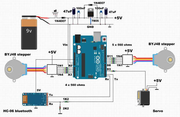 Con la excepción del módulo de bluetooth HC-06, que cuenta con un divisor de tensión compuesto por resistores de 1 K 2 y 2 K 2 ohm para dejar caer la bluetooth RX entrada tensión de 3.3 voltios, resistencias todas son 560 ohmios. El propósito de los resistores de 560 ohm es ofrecer protección a arduino. También hacen más fácil para el protector del alambre.