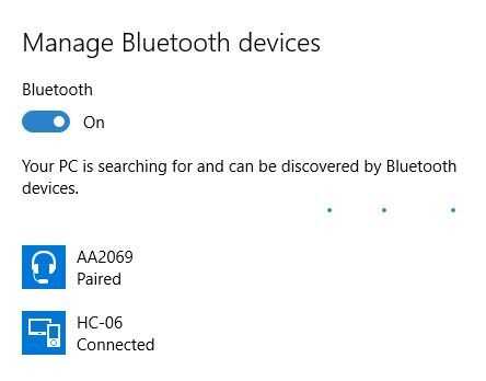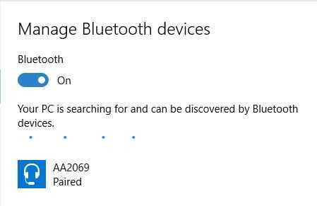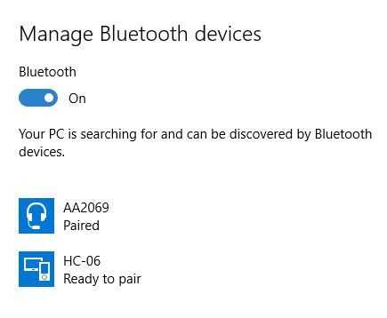 Pulse "Inicio | Configuración | Dispositivos | Bluetooth". La pantalla mostrará el estado del bluetooth de cada dispositivo que puede conectarse. La captura de pantalla inferior izquierda muestra que el PC es actualmente consciente de algunos auriculares bluetooth.