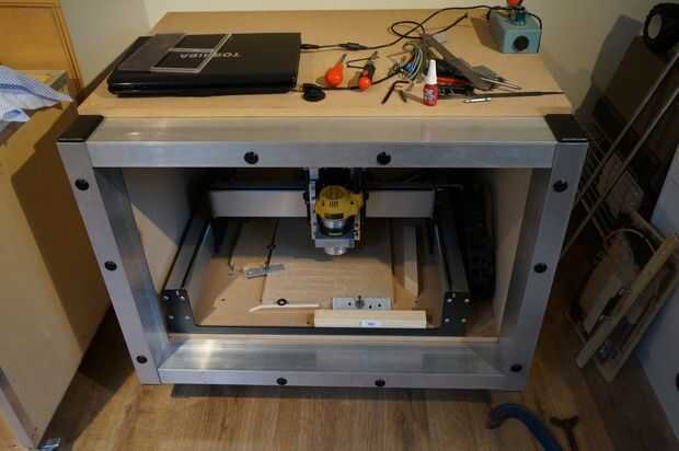 El marco de extensión de tubo de aluminio atornillado a la parte delantera de la caja permite el Shapeoko maximizar su área de trabajo sin necesidad de mantener las puertas en el recinto abierto para que el montaje del huso no golpearlos. Además, usted también puede ver en la foto de que la broca se cuelga sobre el borde de la Shapeoko área de trabajo para que la estructura de tubo de aluminio también permitiría para un trabajo extendido sosteniendo la tabla construida para que el Shapeoko absolutamente puede maximizar su capacidad de corte. Será la construcción y me extendió la mesa de trabajo en un futuro cercano.