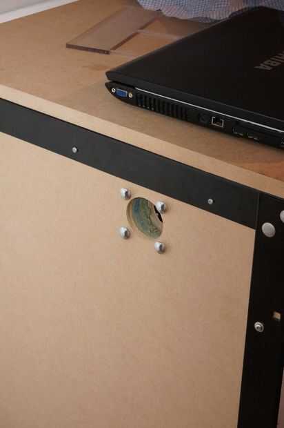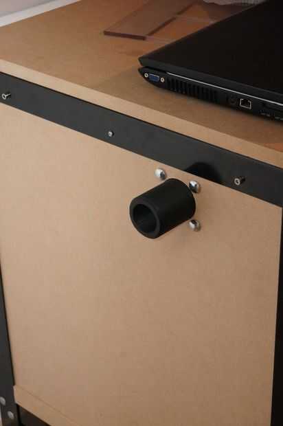 La siguiente característica que estaba dispuesto a incluir en esta compilación fue alguna forma de mantener todo el polvo de airbourne en la máquina. Incluso con puertas cerrado polvo todavía puede escapar cuotas al aire se echó todo dentro de la caja por el ventilador en el eje de Dewalt. Cabe así para conseguir presión negativa dentro de la máquina que dejaría de polvo escapando a través de las lagunas, que añadido a esta entrada que recibe el tubo de mi aspiradora suave pero firmemente.