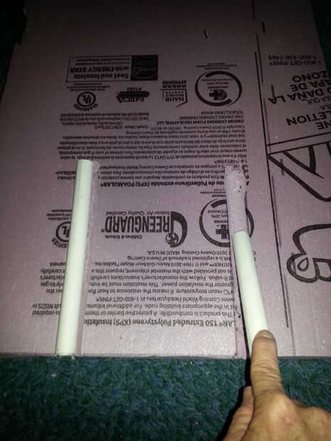 Si iniciaste con espuma gruesa de 2", entonces en vez de pegar debe perforar los agujeros para un lugar insertar los tubos de PVC. Esto puede ser difícil porque los agujeros tienen que ser bastante recto. No todo está perdido si quiebra a través de... spackle justo arriba o hacer el parte de daños del envejecimiento. Prueba de perforación con la espuma acostado en el suelo. Cortar un extremo de la tubería de PVC en un ángulo para penetrar en la espuma. Empuje suavemente, gire y pulse el PVC en el agujero, retire y repita, retirar el crud de espuma a medida que avanza hasta que el tubo ha sido insertado completamente.