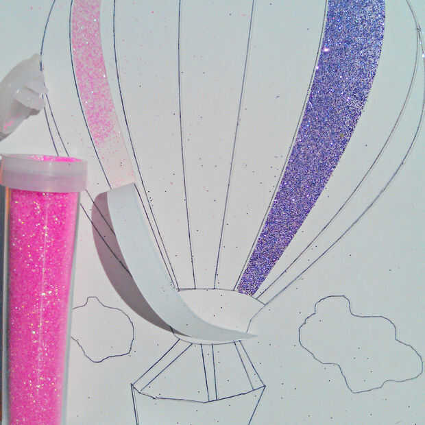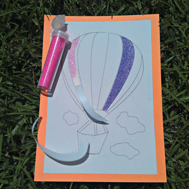Retire su proyecto de la almohadilla de corte. Cortar un trozo de cartulina ligeramente más grande que su proyecto. Rocíe el frente sin cortar (y sin imprimir) del papel de etiqueta con pegamento spray adhesivo. Coloque la cartulina en la parte frontal de la etiqueta sin impresión. Esto le dará su proyecto más rigidez como pelar las secciones y agregar brillo. Voltee el proyecto. Desprenda el respaldo una sección, revelando una sección pegajosa. Agregue el brillo y toque el exceso suavemente. Seguir pelando y rociar hasta que su proyecto esté completo!