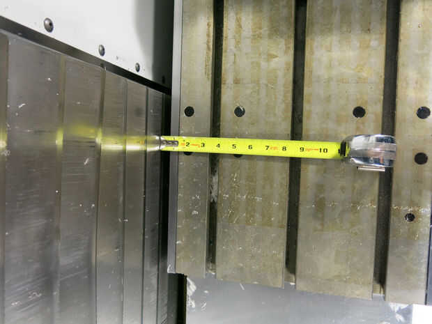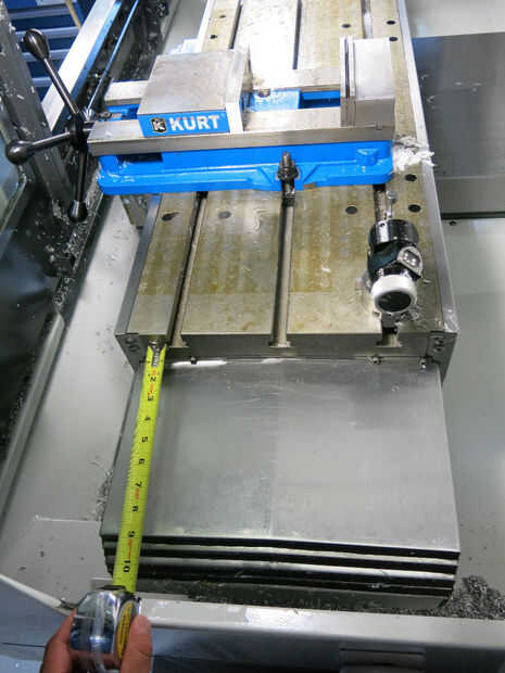 Si usando este método a objetos de molino, que son más grandes que el eje X o Y de la tabla viaja, tenga mucho cuidado al medir el espacio disponible alrededor de su mesa en sus extremidades del movimiento. Un error que una parte sobresalga la tabla de demasiado podría causar protuberancias antiestéticas del recinto de su CNC, o peor daños.) Las fotos de arriba muestran que no hay cleance adicional en la parte posterior de la mesa de un Haas VF2-SS y unos 7" de espacio libre en el frThoughont de la tabla.