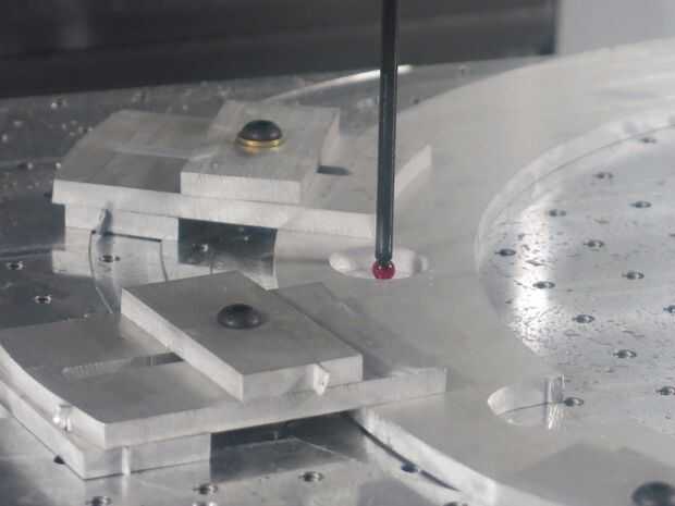 Para probar con precisión puntos de la parte, necesita características cuya posición se puede medir fácilmente. La función más fácil de identificar de forma única, especialmente si hay una rotación desconocida de la parte, es una característica circular levantada o bajada, es decir. un agujero o un 'jefe' a.k.a. 'agujero' (círculos permanezcan igual cuando gira). El punto central de estos se identifica fácilmente al tocar cuatro esquinas del círculo con Renishaw touch-sonda del molino CNC de Haas. Aquí puedes ver los que incorporé varios agujeros alrededor del anillo que me permiten caminar mis coordenadas de referencia alrededor de la parte en la voluntad. De esta manera, era capaz de un anillo de la máquina después de cambiar varias veces en la mesa, por lo que pude molino de todas las partes de este casi 19"(en su más fino) anillo--y en un molino CNC cuyo recorrido Y máximo era solamente 16".