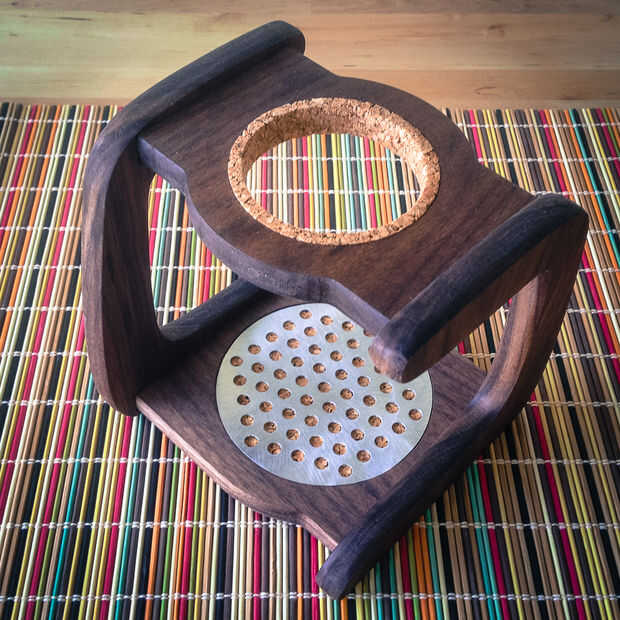 Para estos fines, el soporte es de madera (nogal) y forrado con corcho en un par de lugares para absorber el goteo no deseado. Para agregar algunos muy necesaria pero contraste opcional, un disco de aluminio se agrega a la base en la parte superior del revestimiento de corcho. Las piernas la cara direcciones opuestas, pero cada pierna puede espejarse para hacer un diseño más tradicional.