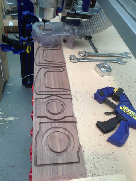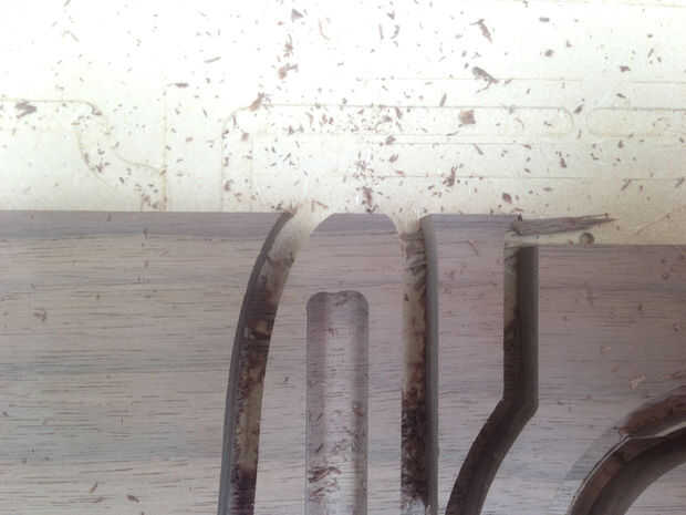 Asegúrese de que la que tienes es suficientemente ancha como para todas las piezas (al menos 7") y que han puesto a cero el bit correctamente. Tenía un tiempo duro manteniendo la tabla delgada de madera que cortaron los perfiles y se estaba debilitando el apoyo interno. Es muy importante mantener un borde de madera sin cortar alrededor de todas las partes para que el tablón no arranca a la hebilla bajo la fuerza de corte. En retrospectiva, yo recomendaría esta atornillado en un pedazo más grande, más fácilmente asegurado de spoilboard.