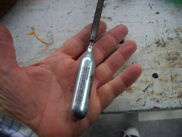 Mi hijo me dio dos cáscaras vacías de Crosman de CO2, y ya no sabía qué hacer con ellos, le pregunté a Foro de Instructables. Jayefuu me dio una buena idea y poner en práctica. Hay otros buenos también, pero fui para él. Este es el resultado.