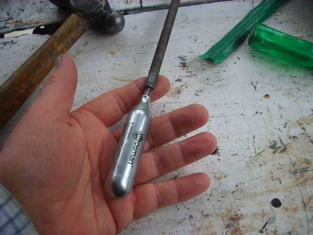 Consigue una tuerca de gran diámetro, poner sobre la mesa o el yunque, basa en su hilo de rosca de la parte inferior del cartucho por lo que el agujero quede hacia arriba. Luego inserte el vástago del archivo en el agujero y un martillo algunas buenas tomas caber bien. Hacer!