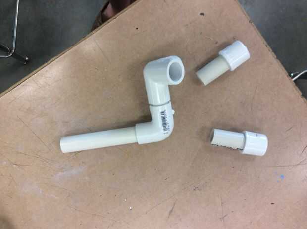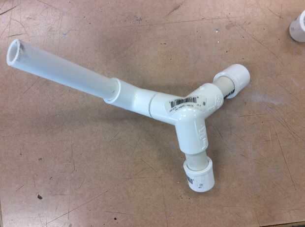 Para crear el trípode tomar pedazos de dos 3 pulgadas de PVC y poner un tapón en el extremo de ellos. Conecte el otro extremo al codo PVC triple. Fije una pieza de 5 pulgadas a un codo y al cuerpo principal. El proyecto final debe verse la imagen de arriba.