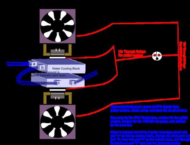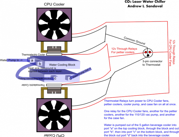 Cada bloque de la refrigeración por agua está conectado con el lado frío de un refrigerador peltier (a.k.a. termoeléctrico). El lado caliente de la nevera está conectado a un refrigerador de la CPU con fans--uno por cada refrigerador de peltier. Dibujando el calor lejos del lado caliente de la peltier el lado frío es capaz de congelar el agua en pocos segundos. Por esta razón, la bomba de agua debe permanecer corriendo mientras que la energía se aplica a los refrigeradores. Además, sin los disipadores de CPU dibujo calor lejos de los refrigeradores termoeléctricos, el lado cool no permanecerá fresco. Tenga en cuenta que el lado caliente puede llegar lo suficientemente caliente para causar quemaduras graves. No aplique potencia a uno hasta que se conecte al disipador de la CPU cooler.