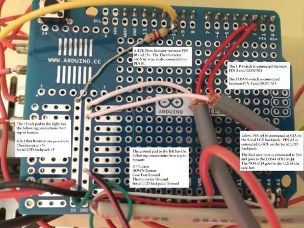 A continuación el cable de la señal de termómetro está conectado al PIN 10. Una resistencia de ohm 4.7 k también se ejecuta desde el PIN 10 en el cojín de + 5 voltios.
